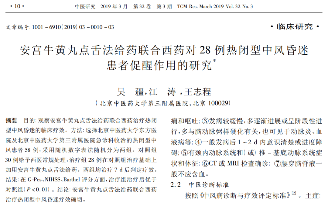 1、中医研究 2019年3月第32卷第3期《安宫牛黄丸点舌法给药联合西药对28例热闭型中风昏迷患者促醒作用的研究》明确指出,安宫牛黄丸点舌法给药联合西药治疗热闭型中风昏迷疗效确切。