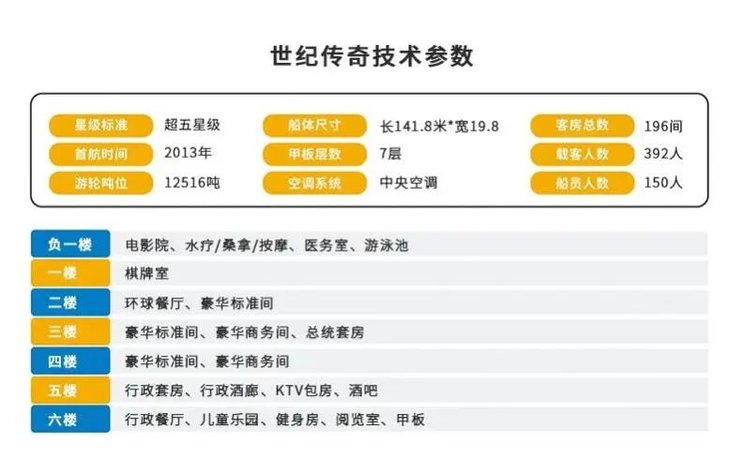 “世纪传奇”于2013年震撼问世,由挪威Yran&Storbraaton公司担纲装饰设计,德国EMS和Schiffstechnik Buchloh公司出任技术指导,长江首次采用“舵浆合一,电力推进”的世界先进科技,全船每一处都精选零油漆环保材料,集七大高新技术和五大长江奢华创新为一体的五星级豪华游轮!是长江上的环保科技静音游轮,舒适度和安全性远非其他游轮可比拟!