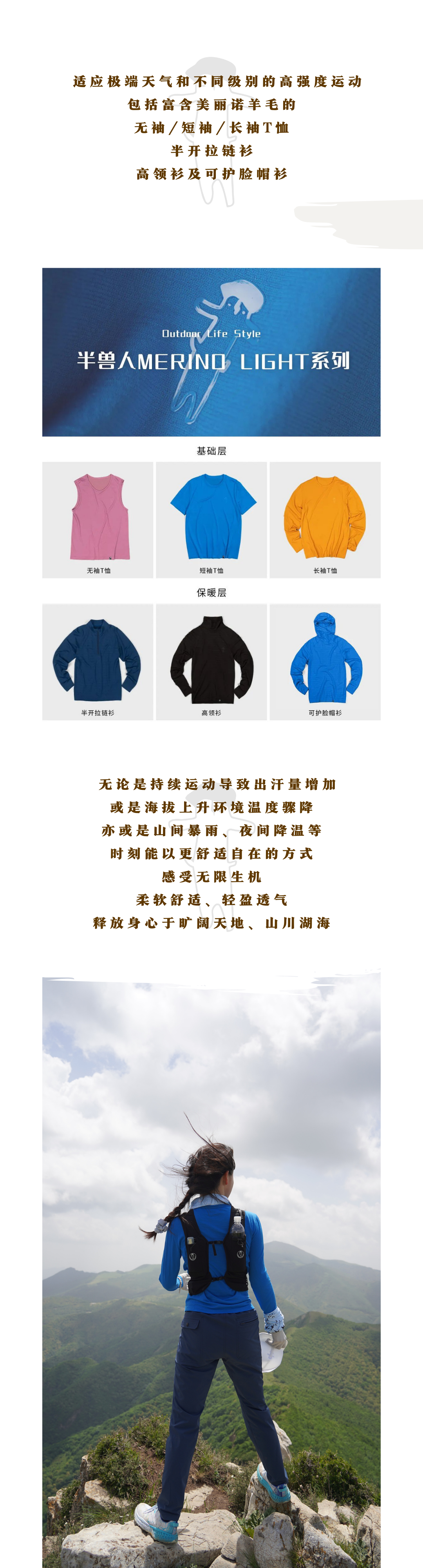 美利奴羊毛被赞誉为“会呼吸的面料”,是大自然赋予的可再生天然材料,环保还可四季穿着,它的诸多优势与户外装备所需功能完美契合,经过多年的运用和改良,设计师将其很好地应用在半兽人 MERINO LIGHT 系列中。