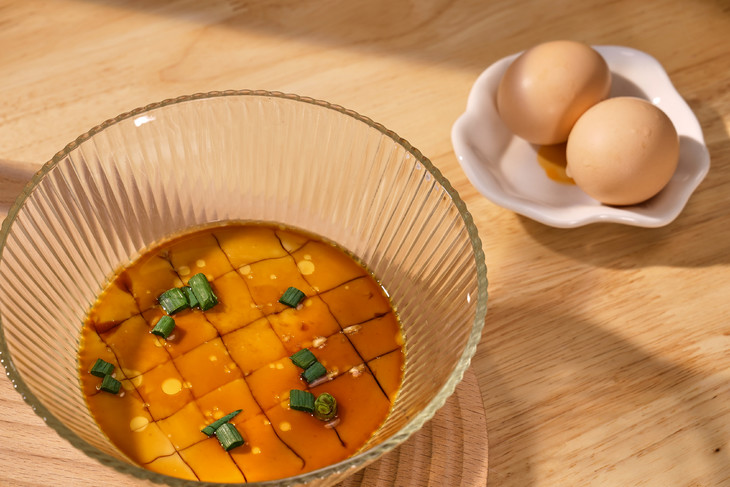 6、鸡蛋出炉后,用小刀划成小格,加入生抽、香油。