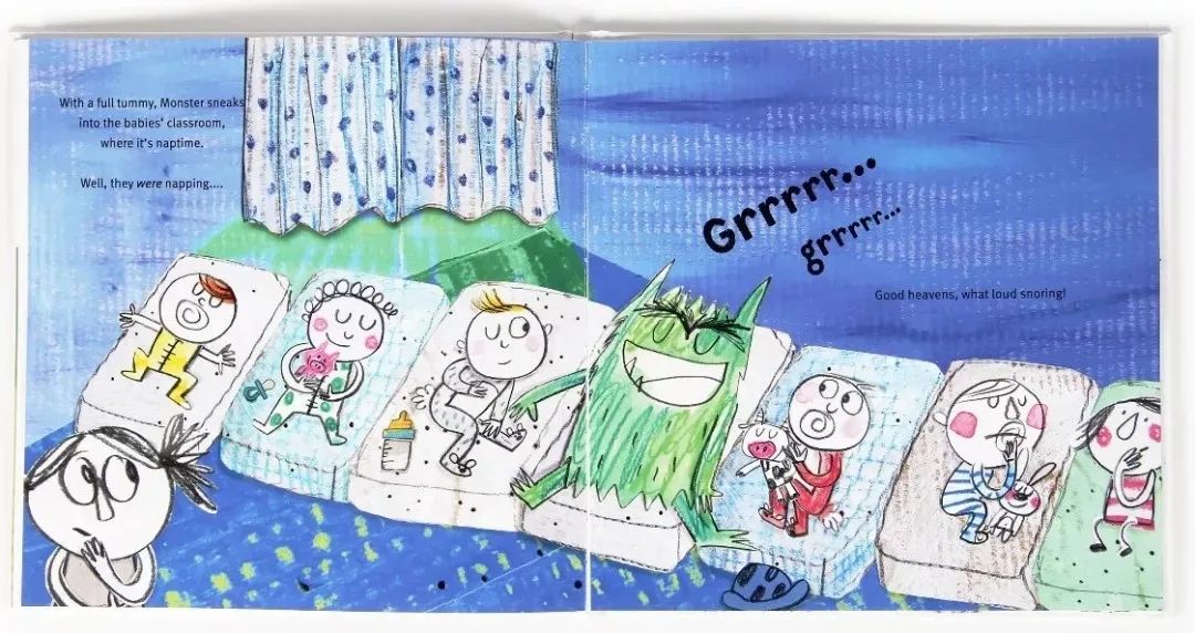 阅读指南:小怪兽潜入了婴儿班,宝宝们正在睡午觉。在插画中可见有些宝宝其实并没有睡着,旁边英文配字:Well, they were napping...