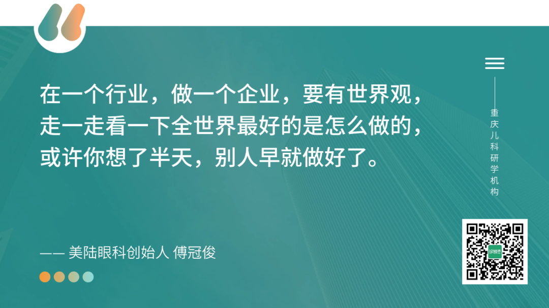 “在创业之初就把专业、国际、公益作为公司的一个发展定位,并且不断的国际化,我们去全球最好的医院看他是怎么装修的,然后去全球最好的大学,看他的视光专业是怎么办的,跟全球很多国家的眼科医院、视光诊所和设有眼科、视光专业的大学都有频繁的链接和多方面的交流。”