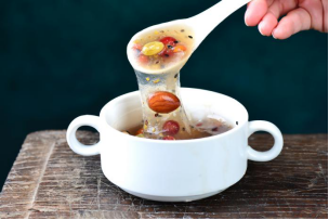 如此一来,冲泡成功后的藕粉色彩缤纷,晶莹剔透。咬一口坚果,清香松脆,伴随淡淡桂花香,与果干的酸甜,满心满口的满足~