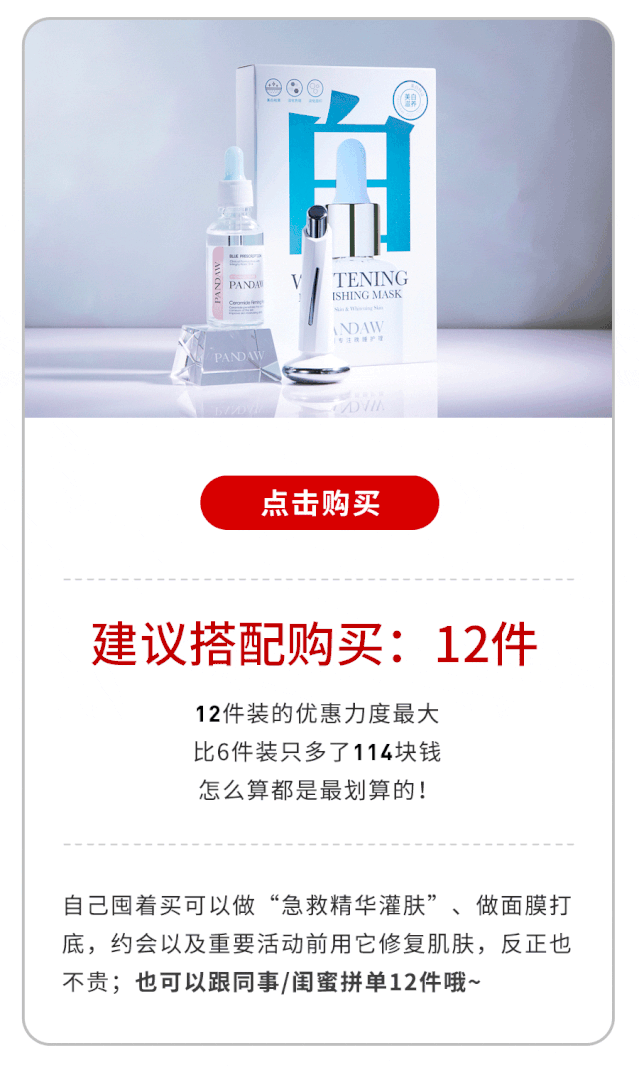 你可以搭配美白面膜或其他面膜,强强联合,加速细胞修复,强韧肌底、美白亮肤。特别适合夏季晒后修复~