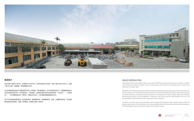 惠安彭艺石业有限公司,位于“中国石雕之乡”福建泉州市惠安县崇武镇龙西工业区创建于1992年,占地面积3.6万平方米,总投资5200万,年生产量4500立方米年产值约8000万。具有自营进出口权,是一家专业从事国内外墓碑、雕刻品等生产加工及安装一体化的石材企业。
