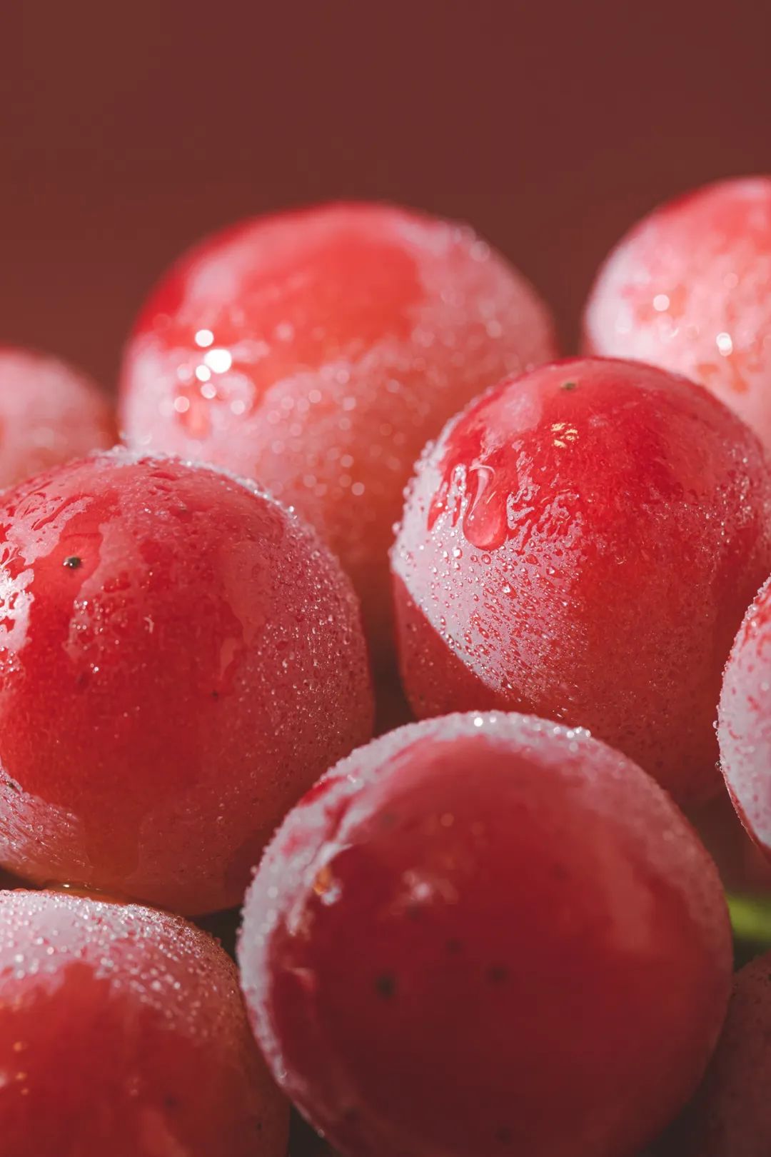 圆润饱满的果实紧紧地抱成一串,晶莹剔透,鲜粉红的果皮看起来娇俏又富丽,很少有水果将两种风格诠释得如此极致。