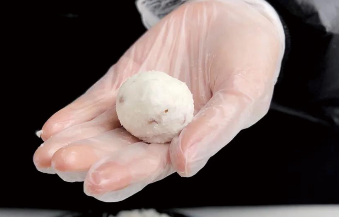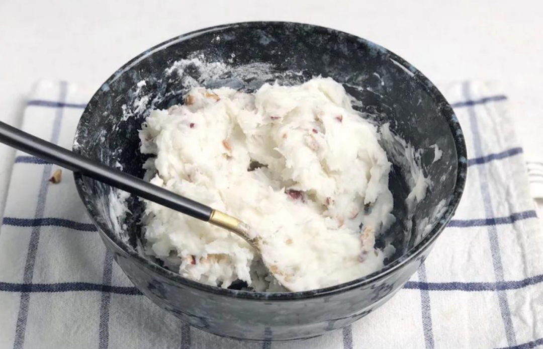 倒入10克白糖、20克牛奶、20克红枣碎、20克糯米粉,充分翻拌均匀至无干粉的状态;