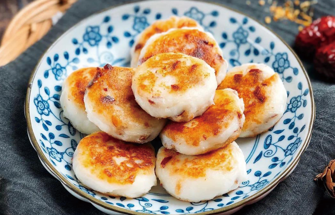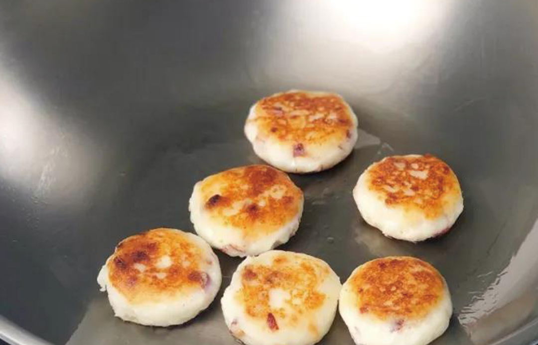 放入锅中倒入适量植物油,放入山药饼小火慢煎,煎至一面上色后翻面继续煎;