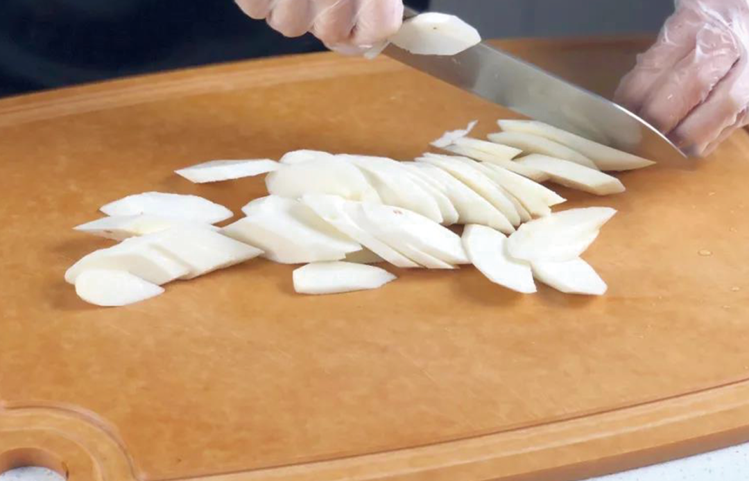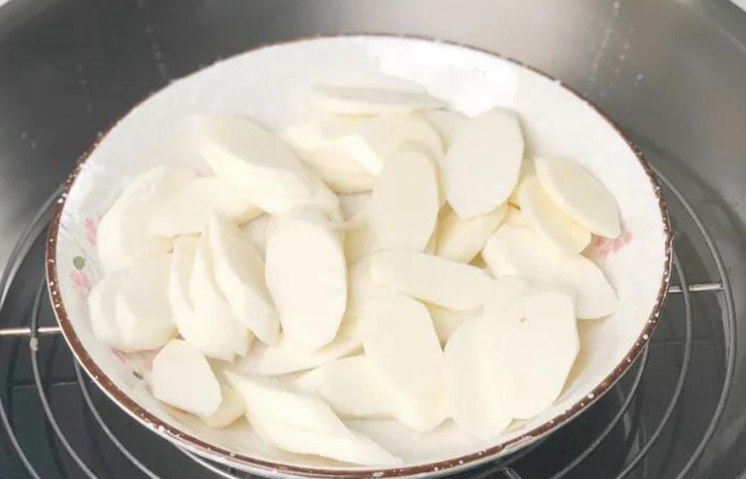 取铁棍山药200克,去皮后冲洗干净切片(建议带手套操作),放入锅中蒸熟;