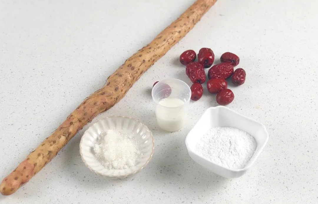 铁棍山药200g , 白糖10克,牛奶20克,红枣碎20克,糯米粉20克,植物油;