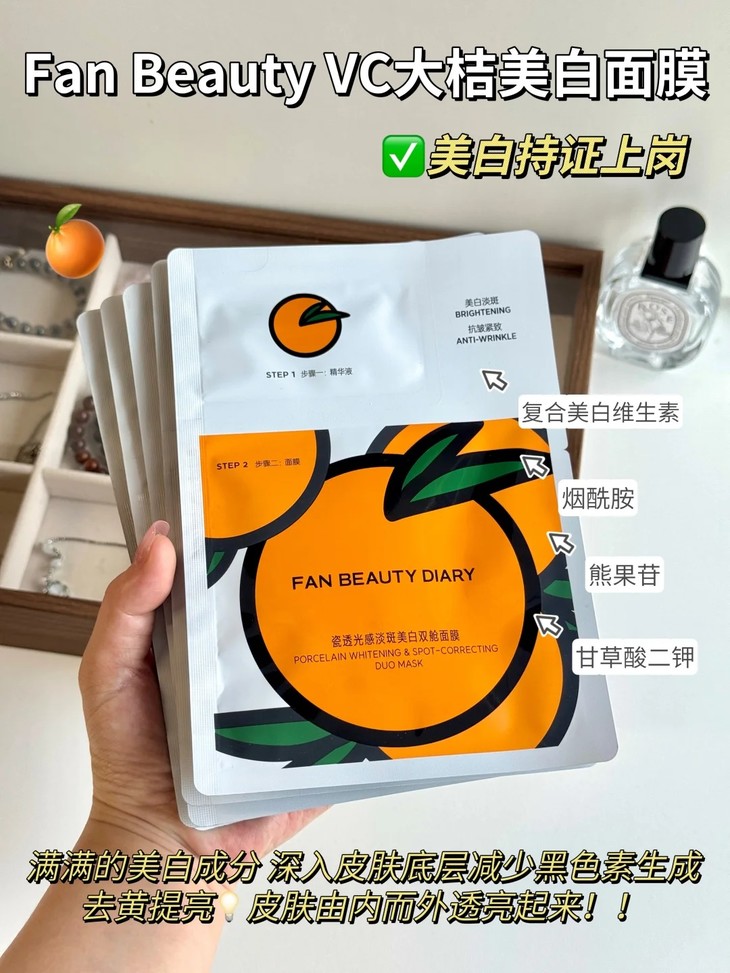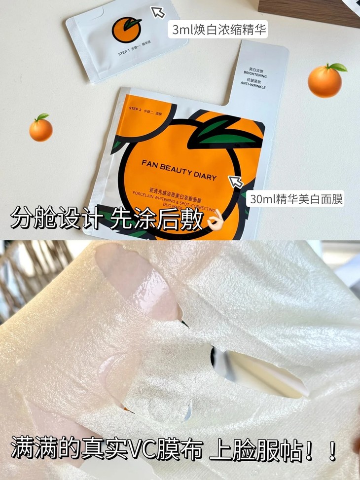 💫Fan Beauty VC 大桔美白面膜 妈耶!这面膜是往里面灌了一整颗橙子吧🍊 满满 VC 精华直接往皮肤里灌!! 成分有多种复合维生素 烟酰胺 熊果苷等美白成分 关键还是分舱设计 先涂精华 再敷面膜 就问这敷完 你不白 谁白⁉ 膜布软乎乎的好贴脸 像第二层皮肤~ 每次暴晒后敷一片 黄黑皮肤退退退🤺 坚持用真的能白到发光!!黄黑皮冲✊🏻 -
