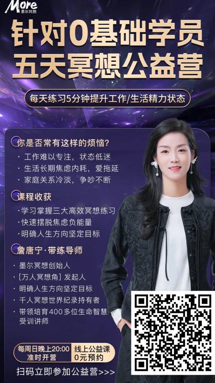 大家好,我是李婷,《5天冥想公益营统班》的学员,在抖音初识唐宁老师,当时看见一个瘦瘦的女孩子在讲冥想,但并不感兴趣便很轻易的划过,或许是冥冥之中注定的缘分,日后总能刷到老师的视频。