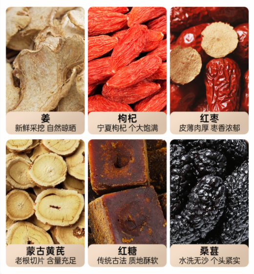 内蒙库伦黄芪、新疆红枣、云南小黄姜、宁夏枸杞,药性充沛,滋养气血效果绝佳~