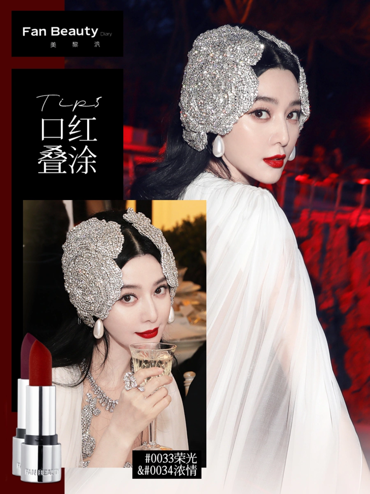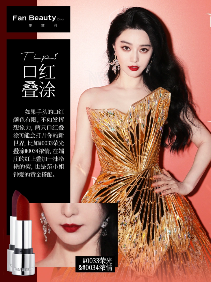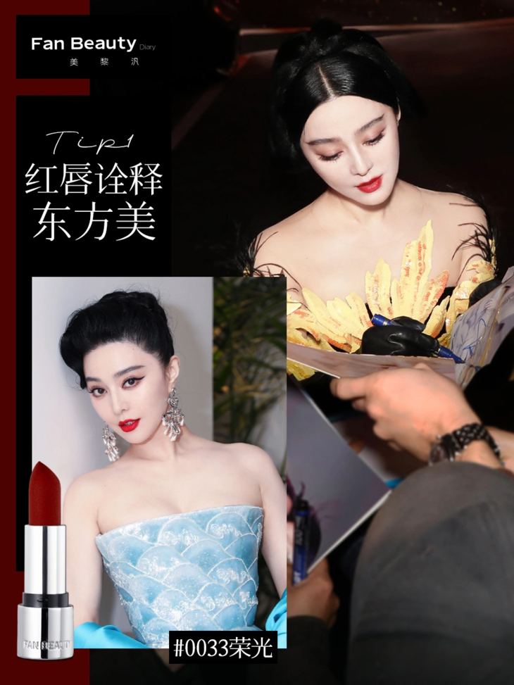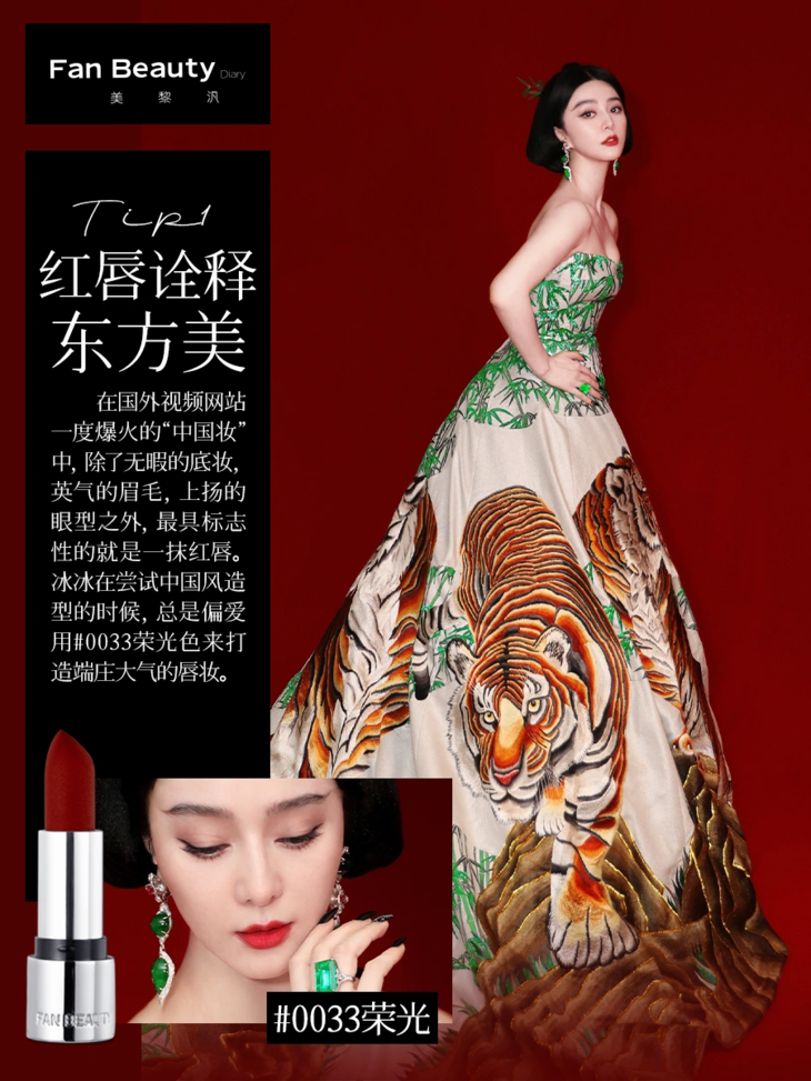 🔖Tip1:红唇诠释东方美:在国外视频网站一度爆火的“中国妆”中,除了无暇的底妆,英气的眉毛,上扬的眼型之外,最具标志性的就是一抹红唇。冰冰在尝试中国风造型的时候,总是偏爱用💄0033荣光色来打造端庄大气的唇妆。