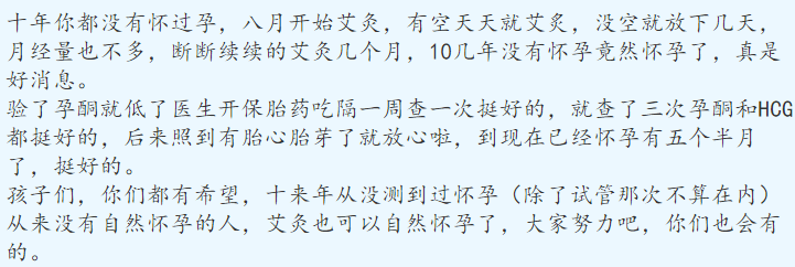 谢谢您的反馈,给更多不孕的调理上的鼓励。十年你都没有怀过孕,八月开始艾灸,有空天天就艾炙,没空就放下几天,月经量也不多,断断续续的艾灸几个月,10几年没有怀孕竟然怀孕了,真是好消息。验了孕酮就低了医生开保胎药吃隔一周查一次挺好的,就查了三次孕酮和HCG都挺好的,后来照到有胎心胎芽了就放心啦,到现在已经怀孕有五个半月了,挺好的。孩子们,你们都有希望,十来年从没测到过怀孕(除了试管那次不算在内)从来没有自然怀孕的人,艾灸也可以自然怀孕了,大家努力吧,你们也会有的。