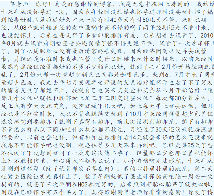 单老师:你好!真是好感谢你的博客,我是无意中在网上看到的,我结婚十来年从没怀孕过一次,因为我年轻时没结婚也怀孕过那时没要就打掉了搞到经期好乱总是推迟好久才来一次有时40多天有时50几天不等,来时也痛经,从08年就开始正经的看中医喝中药不停的喝了两年经期还是不准时来,也没能怀上,后来检查又得了多囊卵巢排卵好差,后来想着去试管了,2010年8月就去试管前期检查老公还弱精了怪不得更能怀孕,试管了一次着床怀上了,到了七周照胎心没有最后清宫终告失败,因为经济问题也没再去试管啦,月经还是不准时来我也不管了爱什么时候来就什么时候来,以前来经时虽然有痛经但经量挺好的不多不少颜色也好,就到了去年2月份开始经期就更乱了,2月份来那一次量超少颜色也差都是咖啡色多,就到6、7月才来了同样量超少色差,我是去年七月发现单老师说的艾灸调理能怀孕也看了不了好友的留言艾灸了都能怀上,我就自己也买来艾炙盒和艾条从八月开始调理“腹部几个穴位中脘位和腰部加上足三里三阴交这些穴位”每次都30分钟左右,反正我有空天天就艾炙,没空就放下几天吧,加上每天早上就去运动,但月经也是不能安时来,我也不管也继续艾就到了10月才来经同样量超少色差但这次感觉到要排卵了就测下真得有排卵,前几次没测到排卵尼,想下有排卵不管怎么样都试下同房吧什么机会都不放过,月经过了30天还没来乳房涨痛得要命,以前也会这样,但有排卵应该排卵后14天就会来经的怎么还没来就我想不可能怀孕吧也没测,就忍住等多几天不来再测吧,已经是第35天了忍不住测了下没想到就同了一次房这次能怀孕了,经量那么少色那么差也能怀上?不敢相信哦,开心得我不知怎么说了,那个激动啊无法形容,十来年从没测到过怀孕(除了试管那次不算在内),我的心扑通扑通的跳尼,第二天赶紧去医院证实是真怀上了,验了孕酮就低了医生开保胎药吃隔一周查一次挺好的,就查了三次孕酮和HCG都挺好的,后来照到有胎心胎芽了就放心啦,到现在已经怀孕有五个半月了,真得好谢谢单老师你非常的感谢!你发了博客给了不少人的鼓励真得太好了。