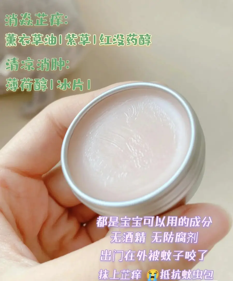 特别夏天有些宝宝睡醒,就发现手脚上全是蚊子包,肿起来痒得让人心疼。可以挖出来一点点✨袋鼠比比婴儿紫草膏✨,转圈圈式涂抹,避免宝宝抓挠损伤皮肤。用这种含有薄荷醇、冰片成分的,有一点冰凉效果, 可以让宝宝的蚊子包处减少痒痒感。