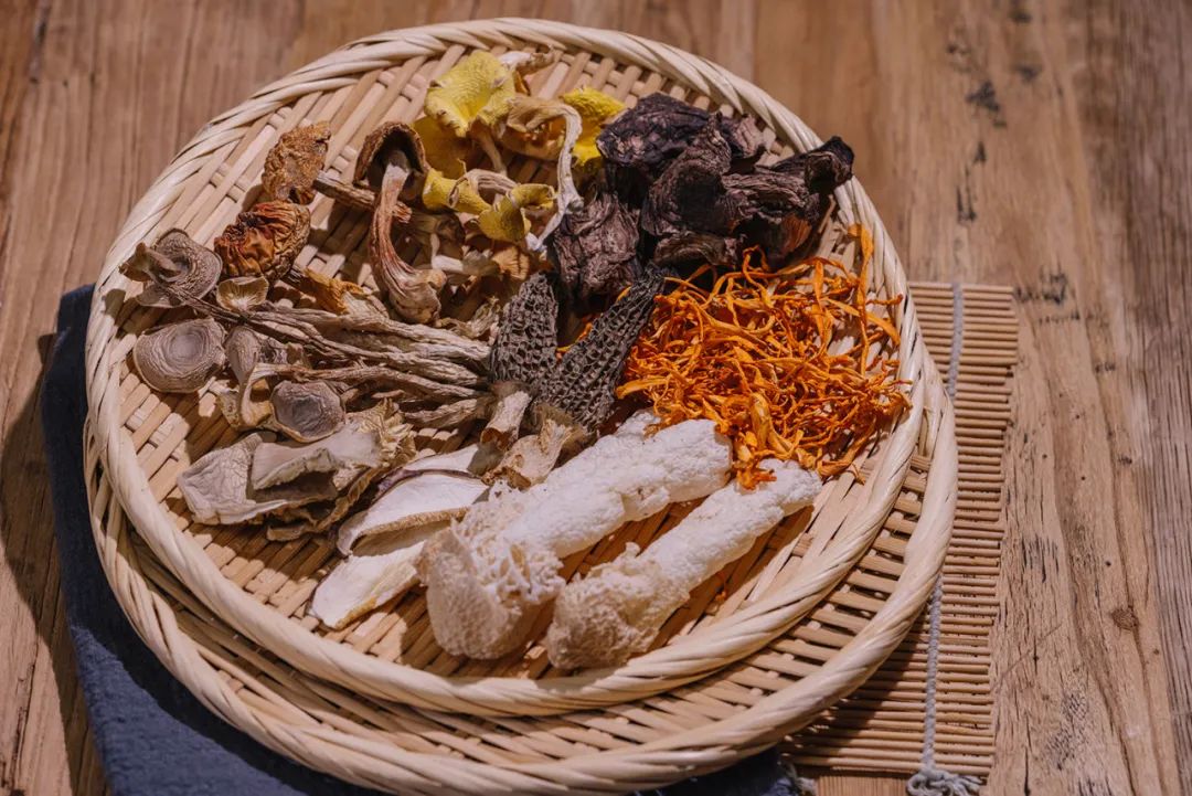 虎掌菌负责香、姬松茸透着鲜、鹿茸菇弹牙爽口、北风菌鲜甜有嚼劲、鸡油菌脆嫩、再加上头牌羊肚菌,还有能化腐朽为神奇的竹荪,最后再用艳丽的虫草花丰富感官体验。