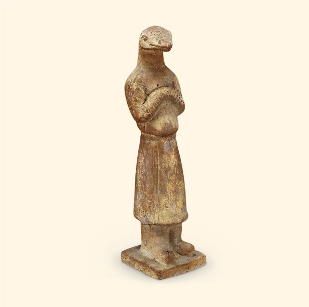 而唐代陶画彩十二辰之蛇俑则以蛇首人身的形象出现,身着长袍、拱手直立,栩栩如生。