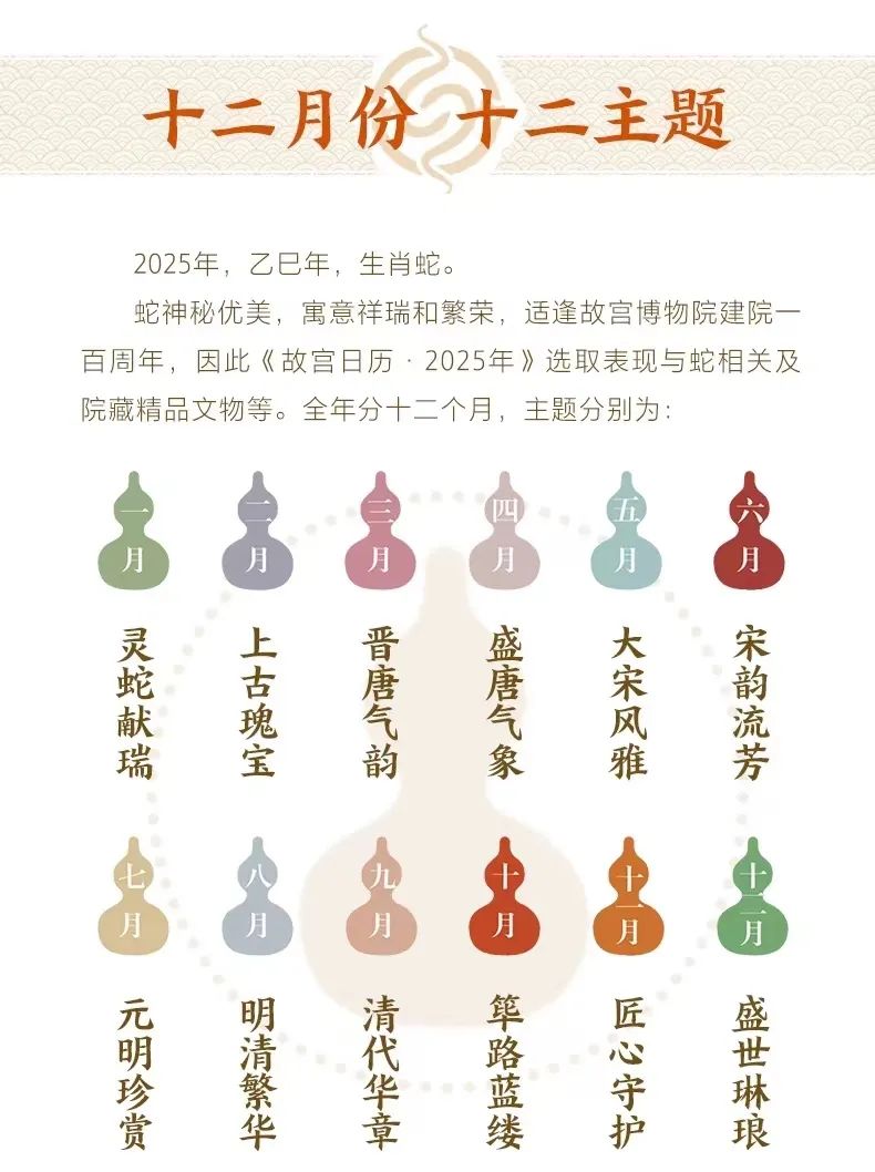 2025年是乙巳蛇年,因此故宫日历以“金蛇万里 灵蛇献瑞”为主题,选取表现蛇文化相关文物,按月份组成了12组小主题。
