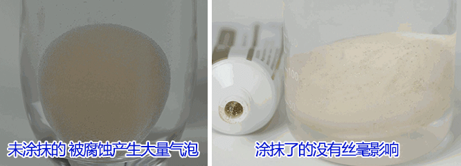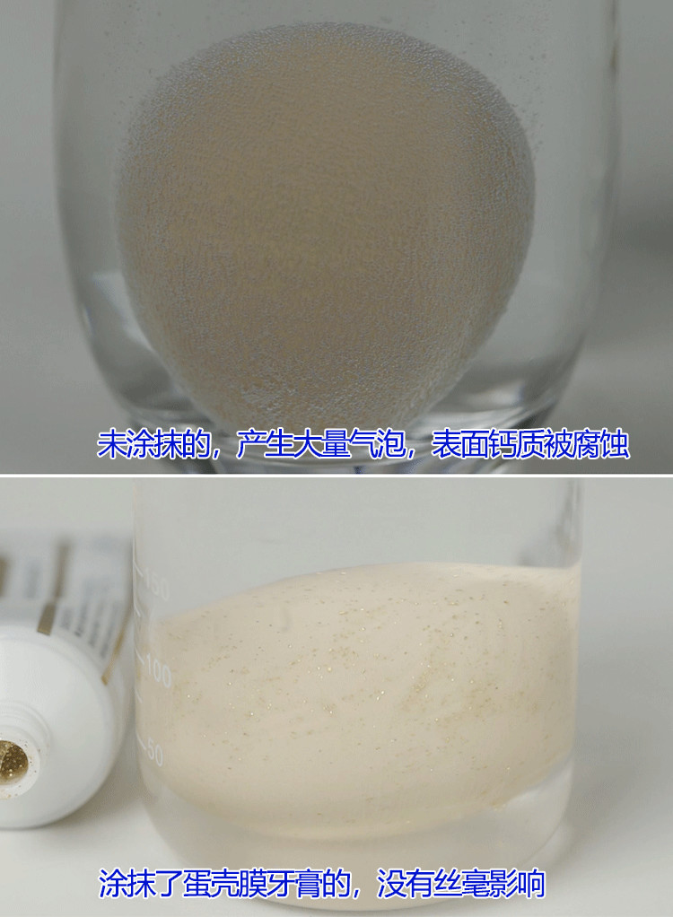 浸泡在醋精中的两个鸡蛋,没涂抹Amave奢金蛋壳膜牙膏的,快速开始被腐蚀,产生大量气泡,而涂抹了Amave蛋壳膜牙膏的,却丝毫没有被腐蚀的现象。