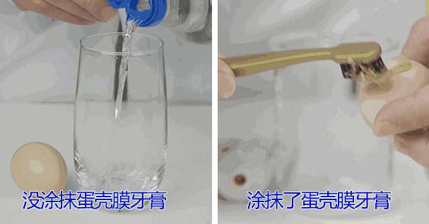 浸泡6小时后,未涂抹过Amave奢金蛋壳膜牙膏的,已经完全失去钙质,鸡蛋软趴趴,只剩一层蛋壳膜包裹着未被腐蚀,涂抹了的完好无损。
