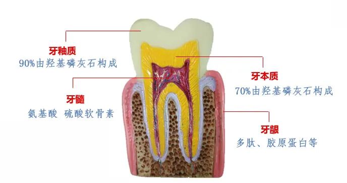 而牙齿的牙釉质,90%由羟基磷灰石构成,牙本质、牙髓、牙龈也由氨基酸、多肽、硫酸软骨素等多种物质构成。