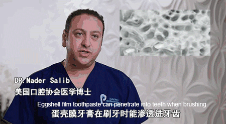 DR.Nader Salib 美国口腔协会医学博士介绍,蛋壳膜与牙齿成分匹配,无缝连接,6小时长出2.5微米晶体修复处,其成分、微观结构和力学性能和天然牙齿一模一样。