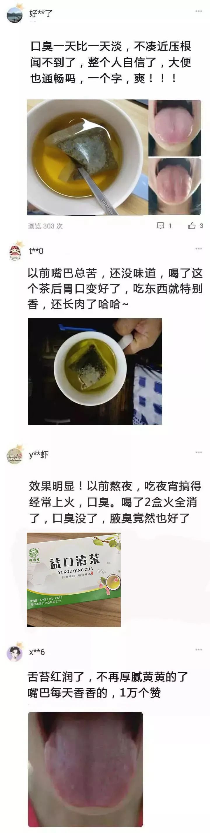 常年舌苔黄腻,发臭,嘴巴里总没味道,中医说内火太旺,我决定内调,去年开始喝益口清茶。一周后口臭减淡了,胃里巨舒服,一个月时黄苔就淡了,舌头每天都干净一点,中间的裂缝也没了!口臭自然也消失了。