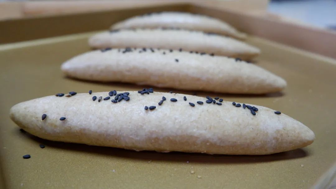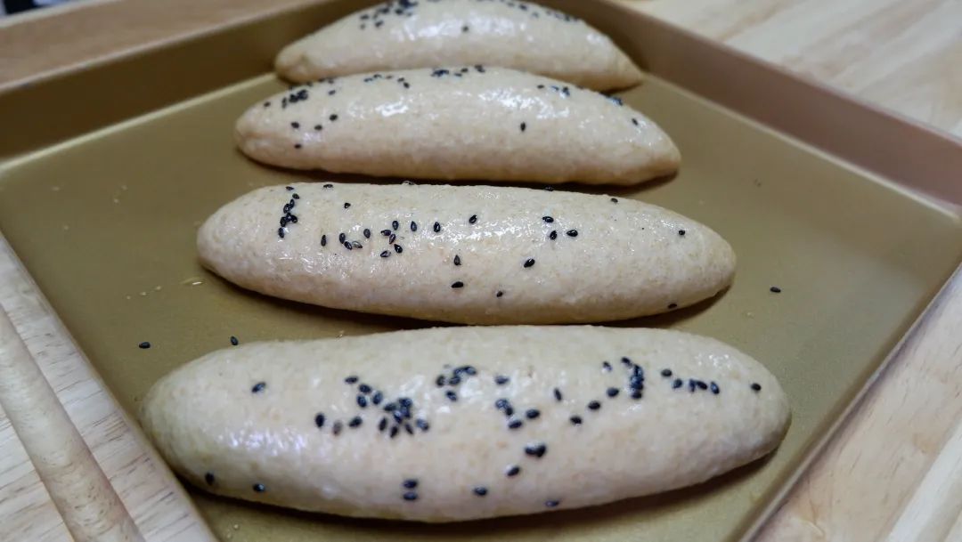 将整好型的面包放入烤盘表面撒上黑芝麻,进行最后的发酵