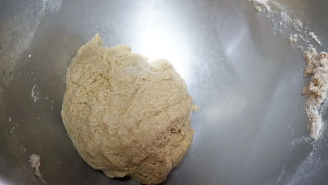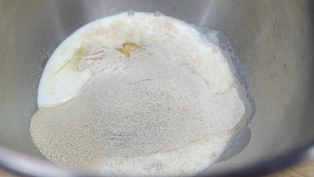 搅拌缸里加入易小焙全麦面包粉,盐,糖,酵母,牛奶,鸡蛋,将面团搅拌至形成厚膜