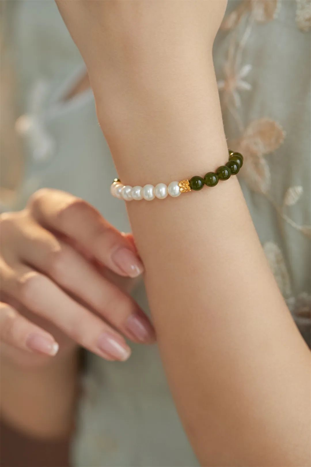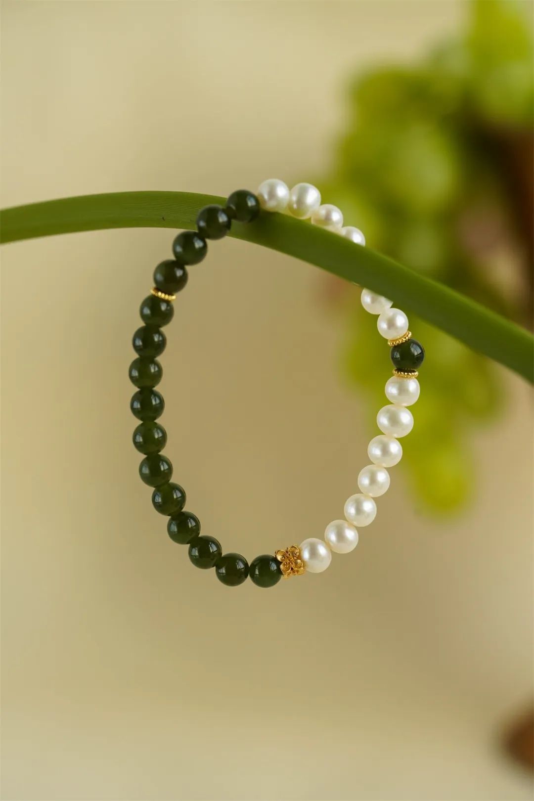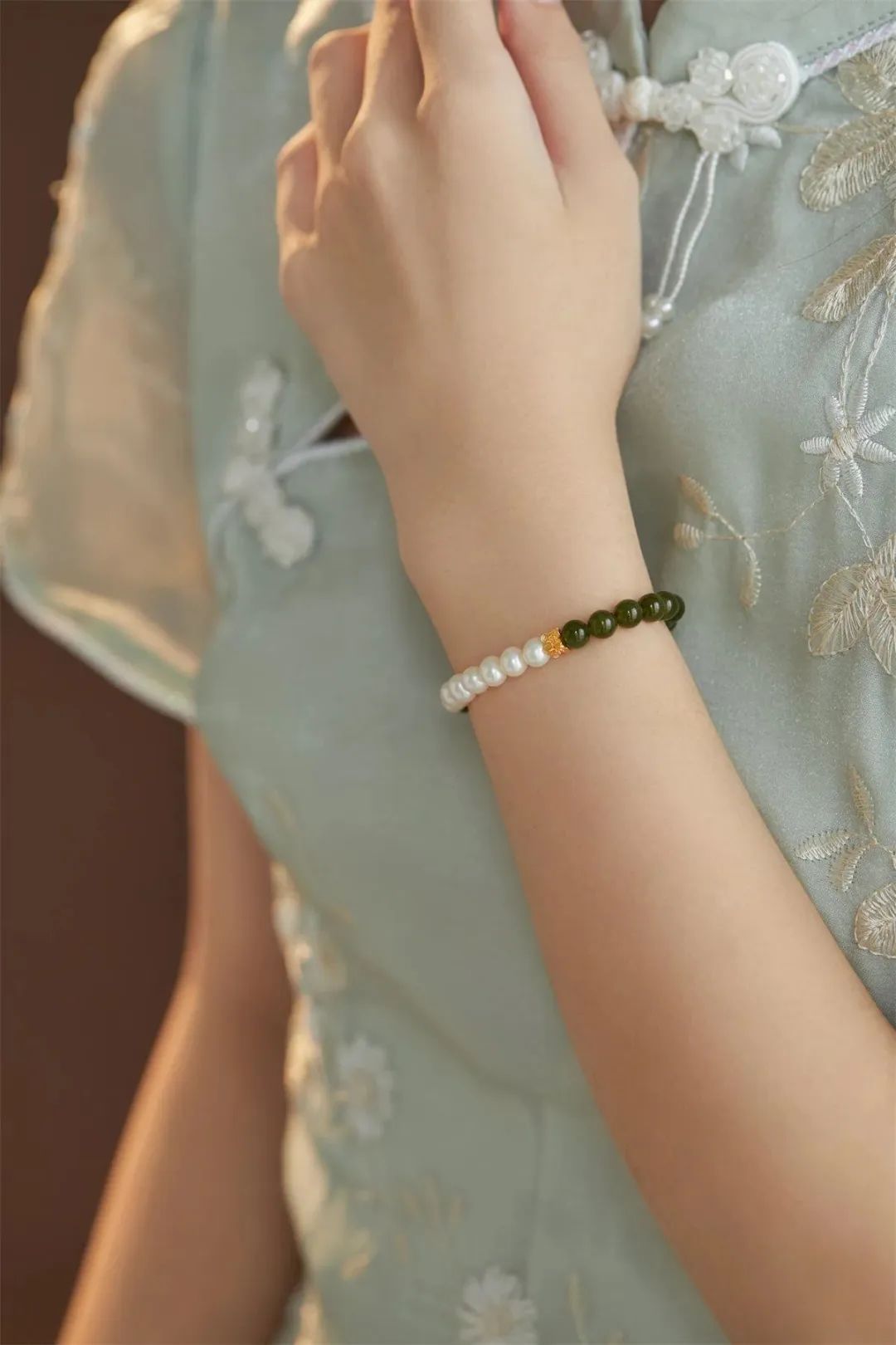 一半珍珠一半碧玉,精选近圆无暇强光的淡水珍珠和少杂无黑点的碧玉串制,两者的光泽交相辉映,衬得肌肤胜雪,高贵优雅,自带高级感,很适合中国人的秉性和气质。