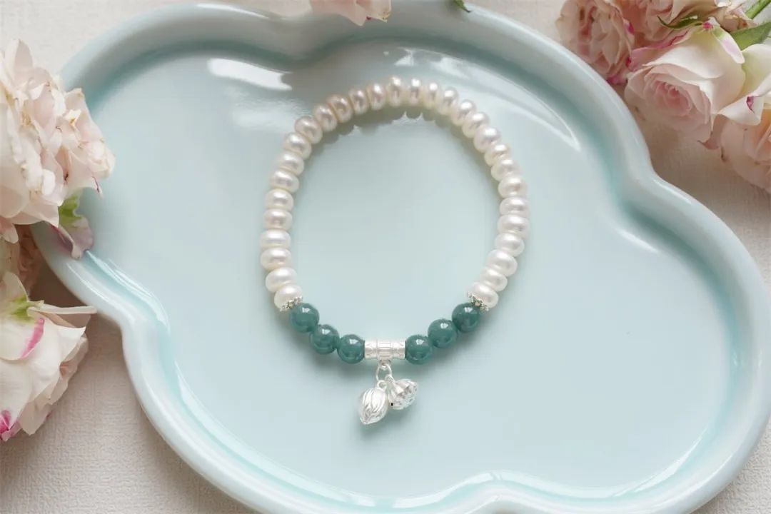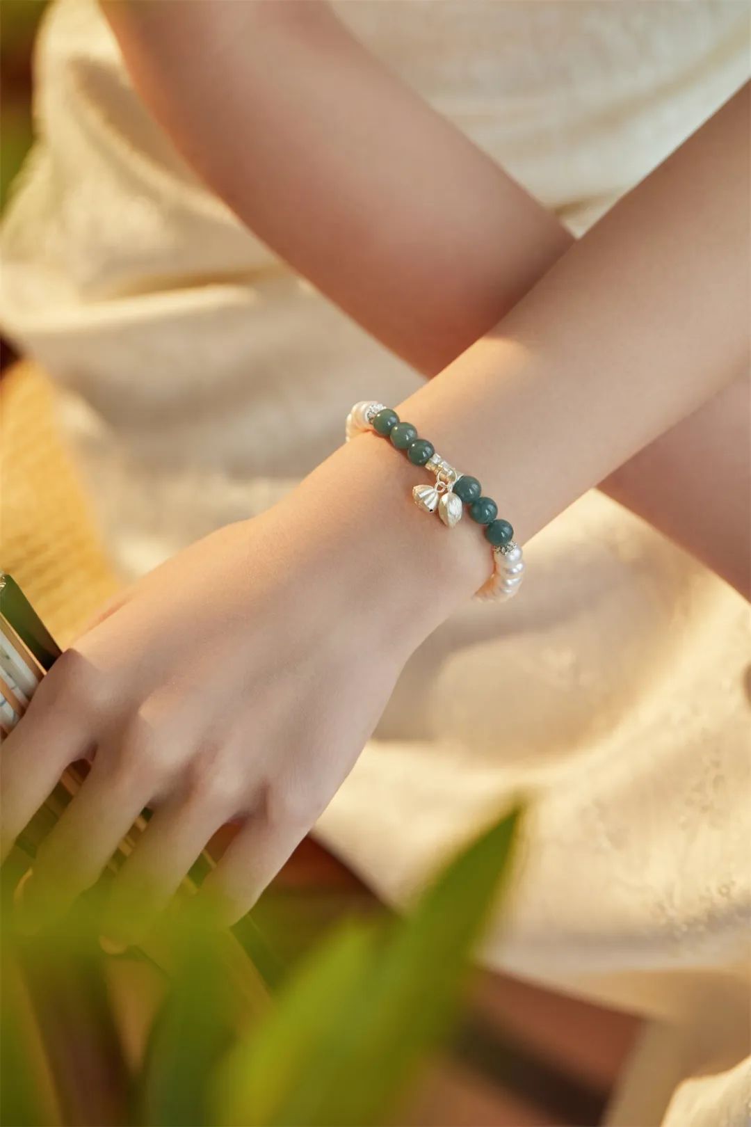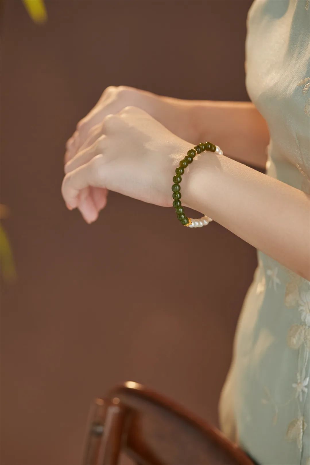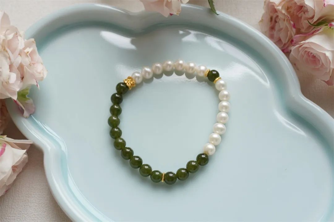 一半珍珠一半碧玉,精选近圆无暇强光的淡水珍珠和少杂无黑点的碧玉串制,两者的光泽交相辉映,衬得肌肤胜雪,高贵优雅,自带高级感,很适合中国人的秉性和气质。