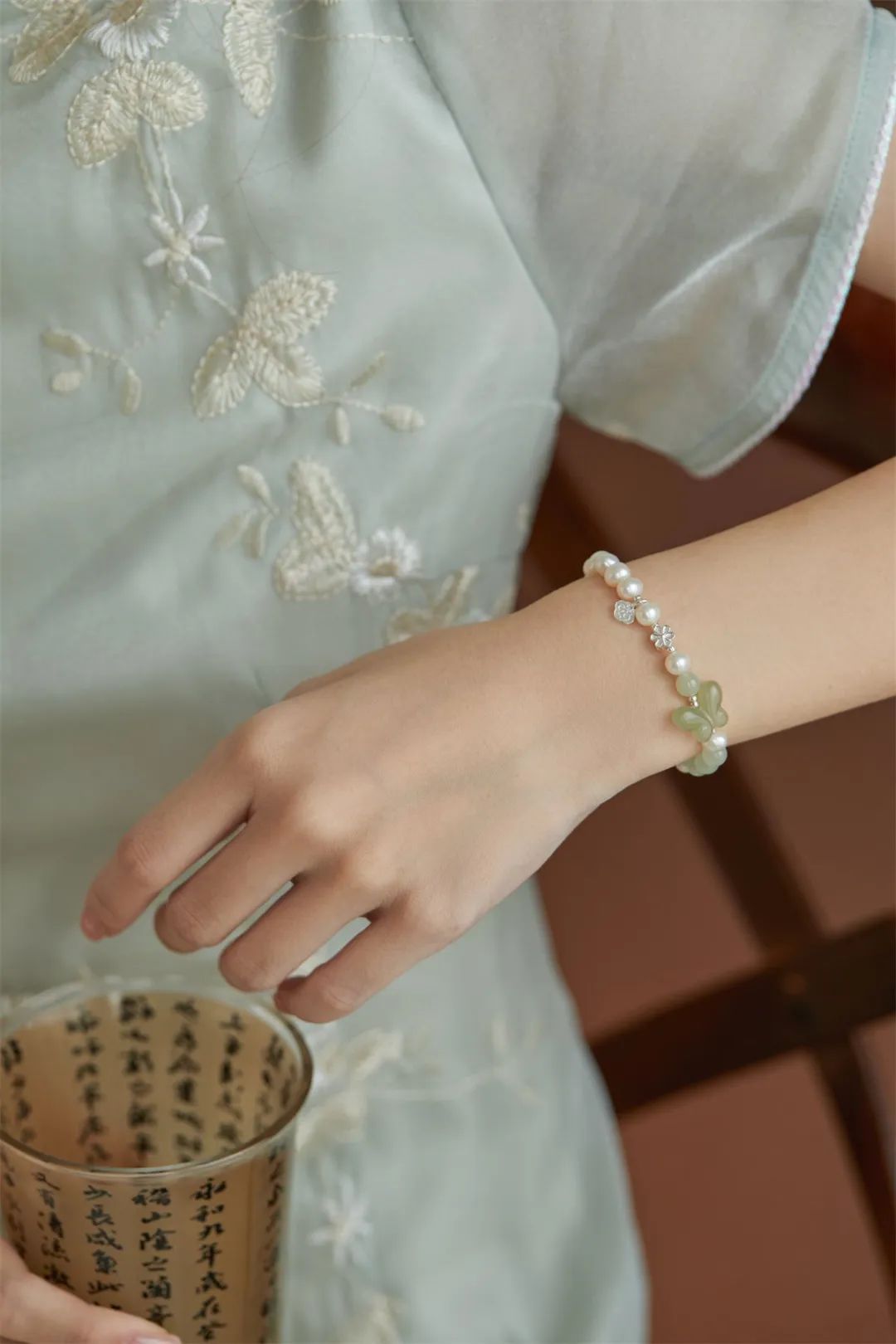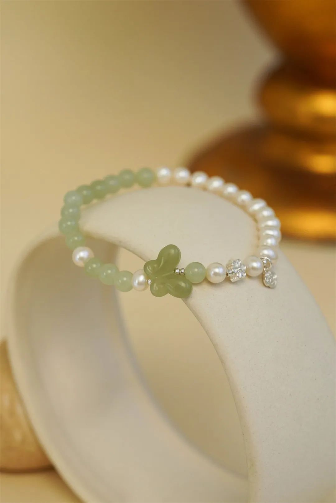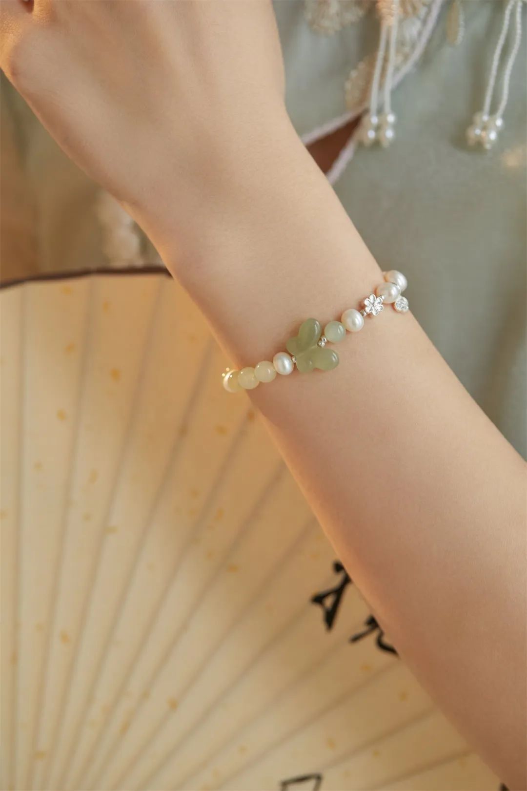 搭配和田玉蝴蝶和纯银花朵点缀,冰清玉洁,含蓄内敛,温柔至极。