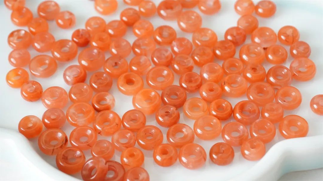 冰飘南红跑环,色泽清润动人,饱满的南红小隔珠做点缀,独具特色的柿子红。