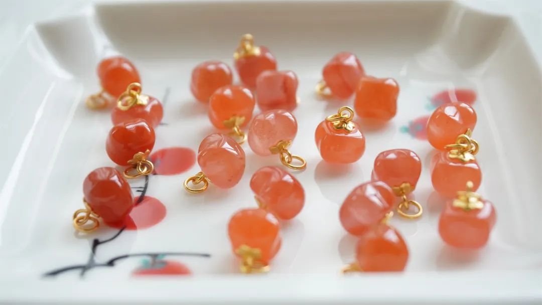 冰润透亮的冰飘南红雕刻成小柿子红润通透,生动水灵,娇俏可人,别致清新。