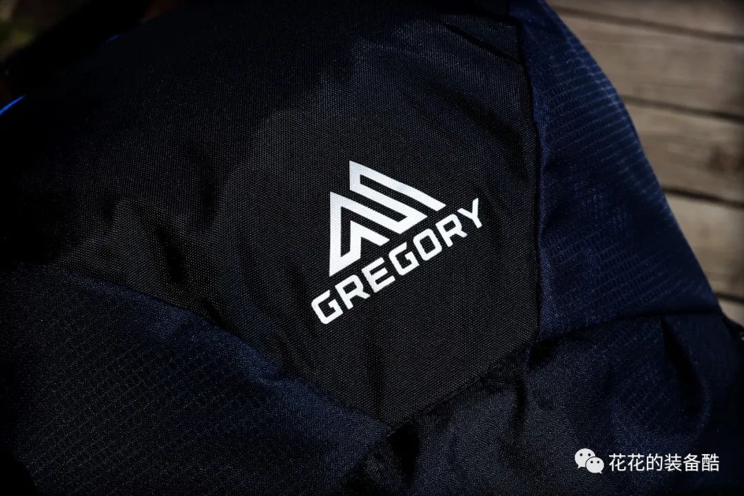 正面Gregory的白色Logo印制在深蓝色420D布料上,具备一定的反光效果,提高低光环境的被动安全。