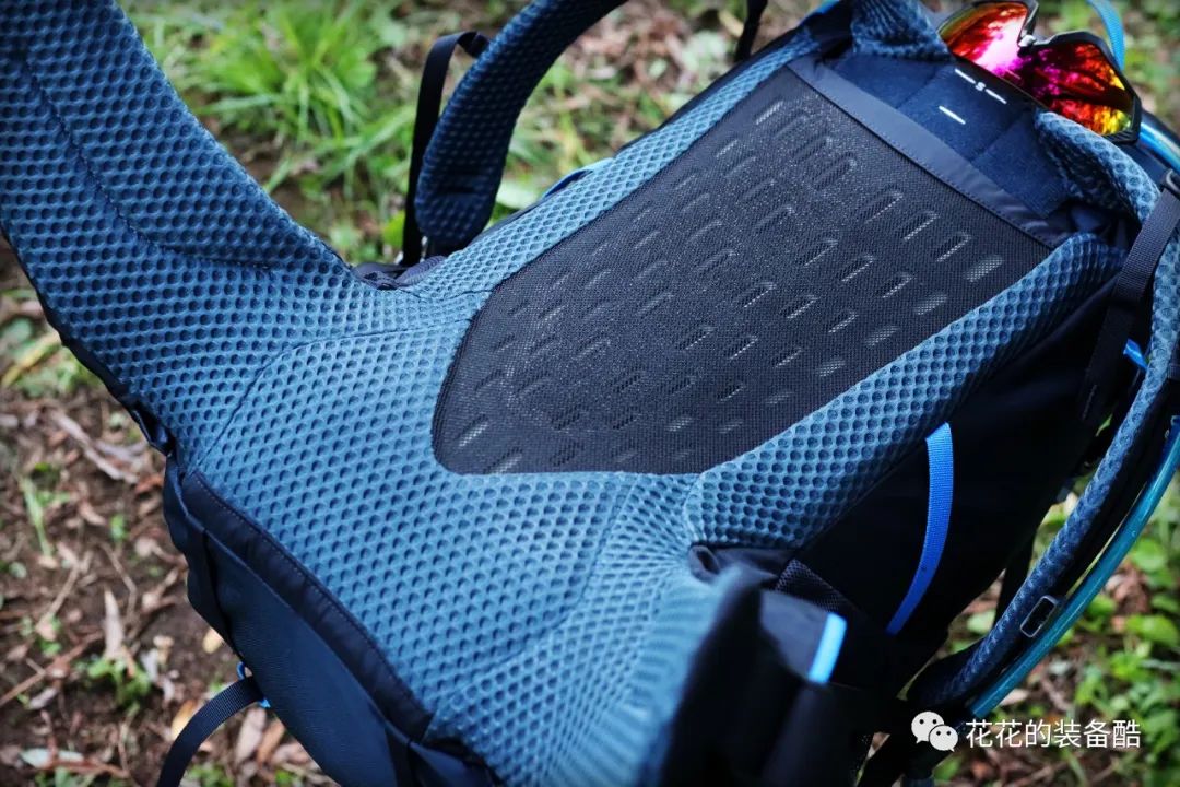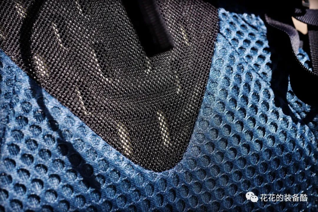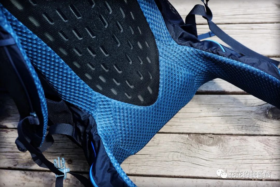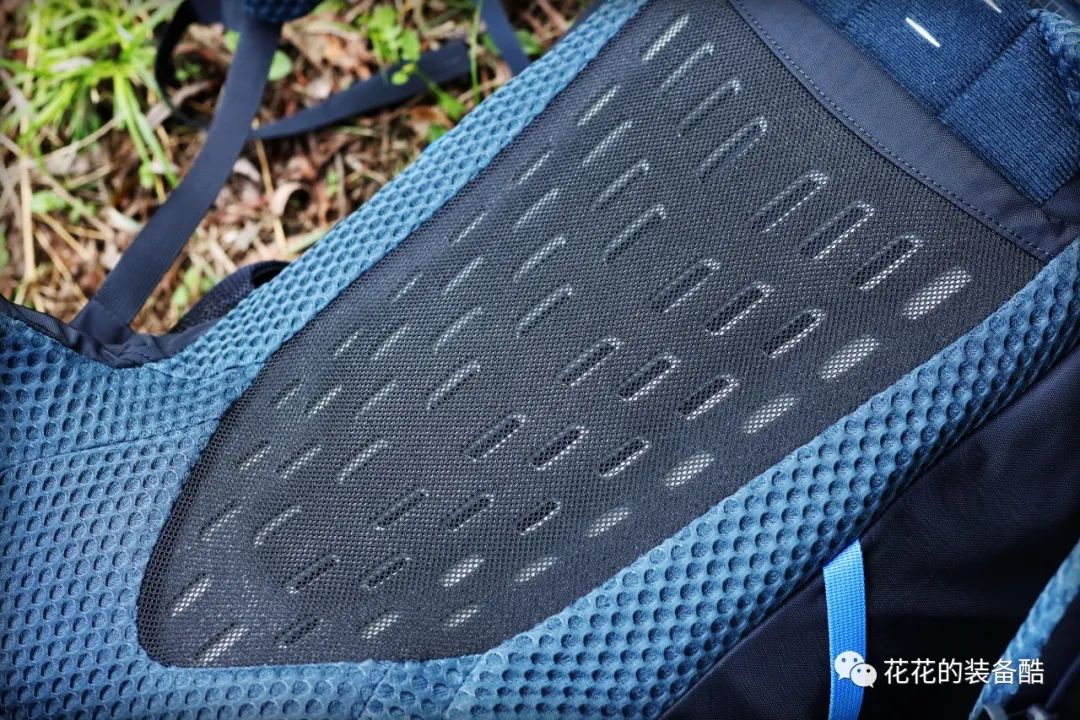 (3)皮肤——背部中间接触位置采用黑色透气弹力网,速干能力超强,而且这个弹力网是悬空的,与弹性衬板之间存在一定距离,给空气流动提供空间。