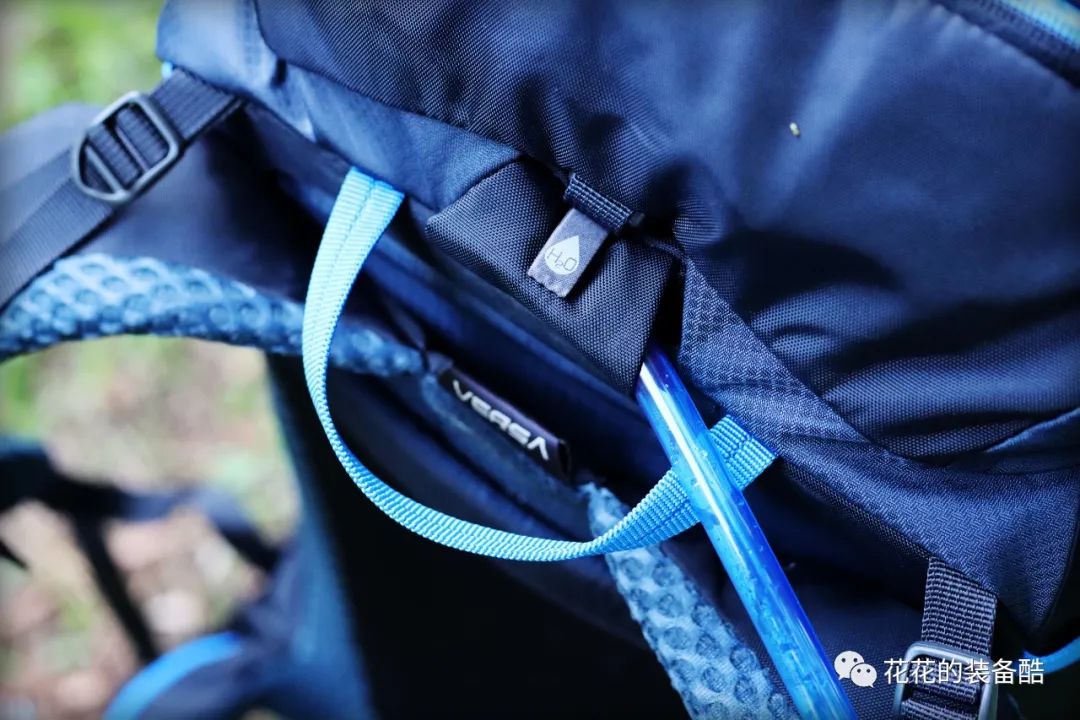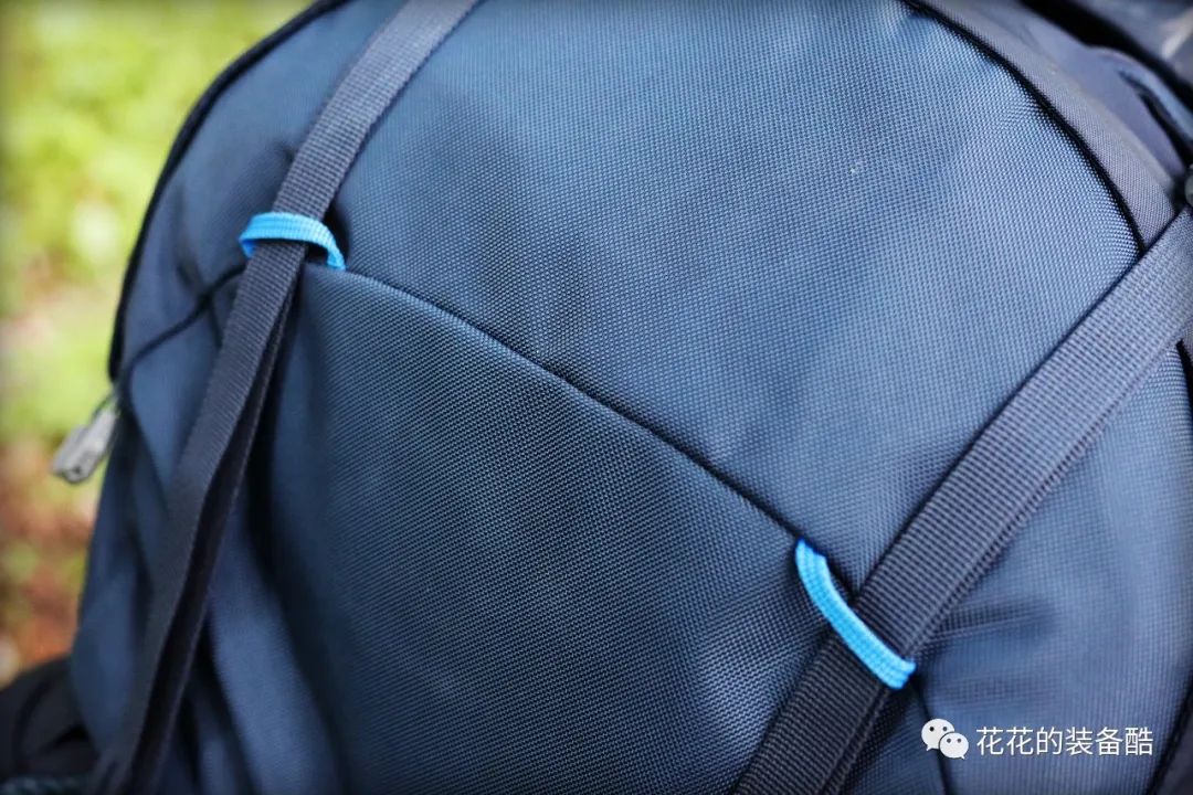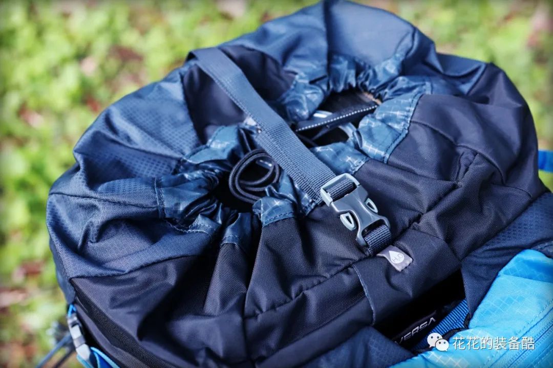 顶包两角通过轻量化织带扣具固定在包体正面,满载放长辅助封闭主仓;