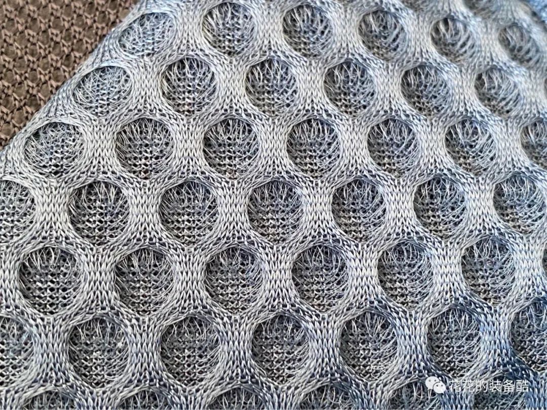 中间层纤维一圈一圈的像弹簧一样,具备较好的弹性提供形能力,拉开表面与底层之间的空间,构建排汗速干的通道;