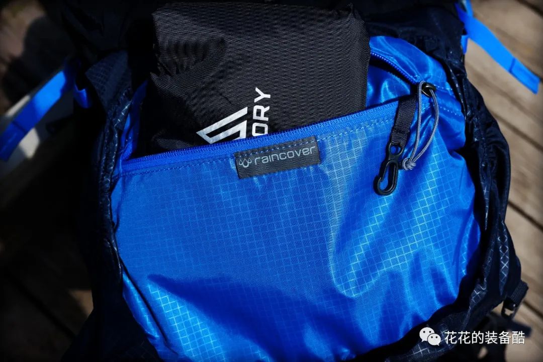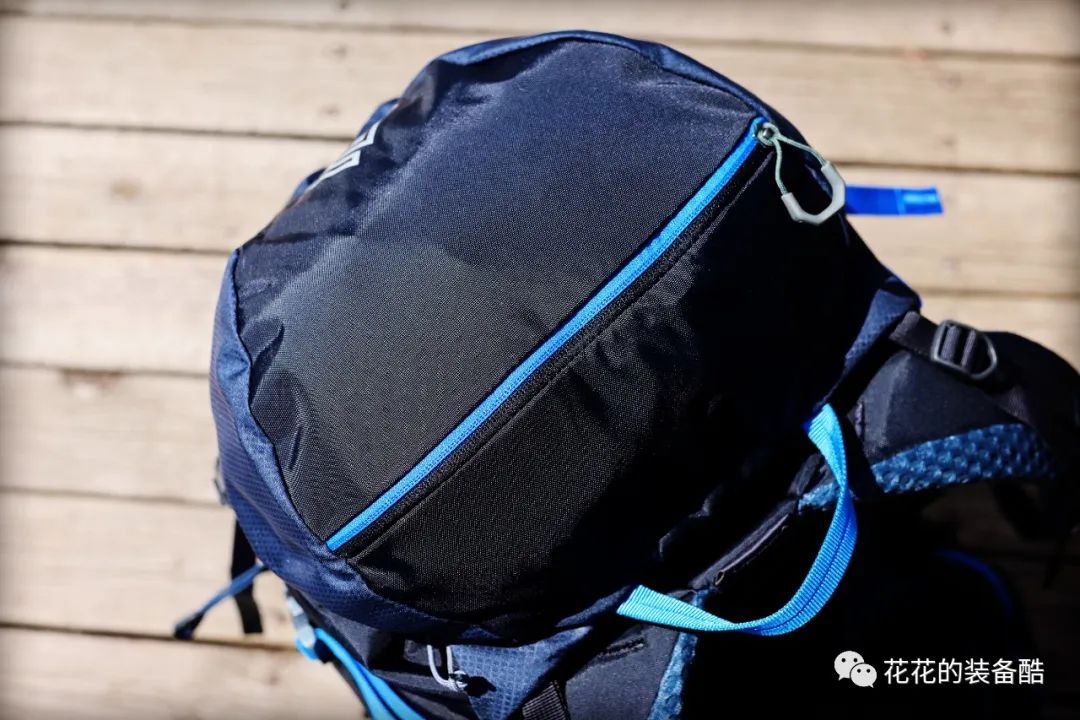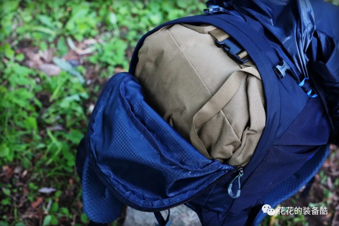 金石45L的内双层顶包采用单开拉链锁闭,拉链开度25cm,深度21cm,容量约为3.1L,三片式缝制提高立体空间,一件冲锋衣轻松塞入,给我们存放手套、雨披等物品提供拿取便利。
