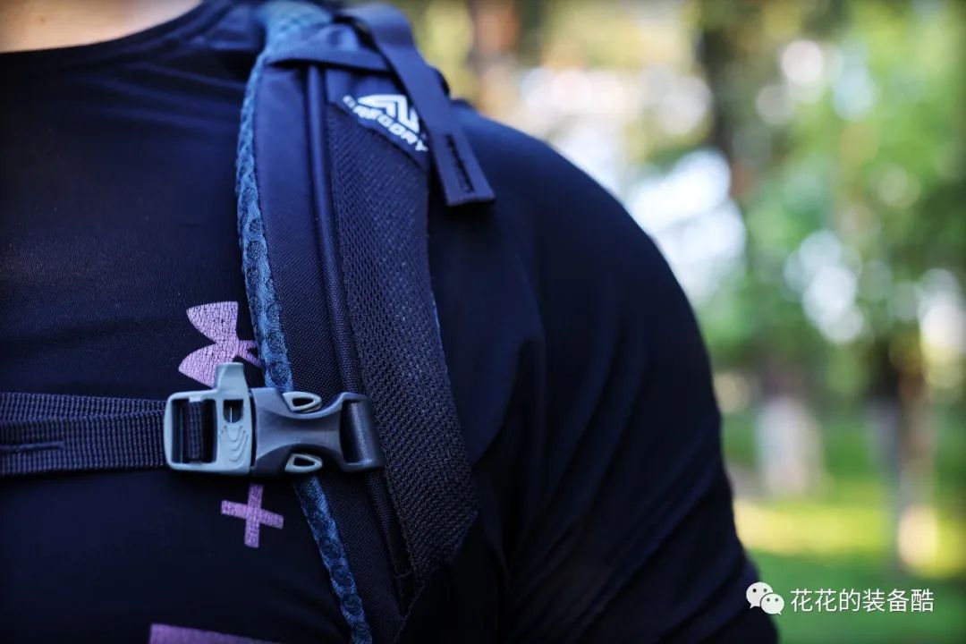 金石45L的肩带配置齐全,包括重心带、水袋管固定带、可调高度胸扣。