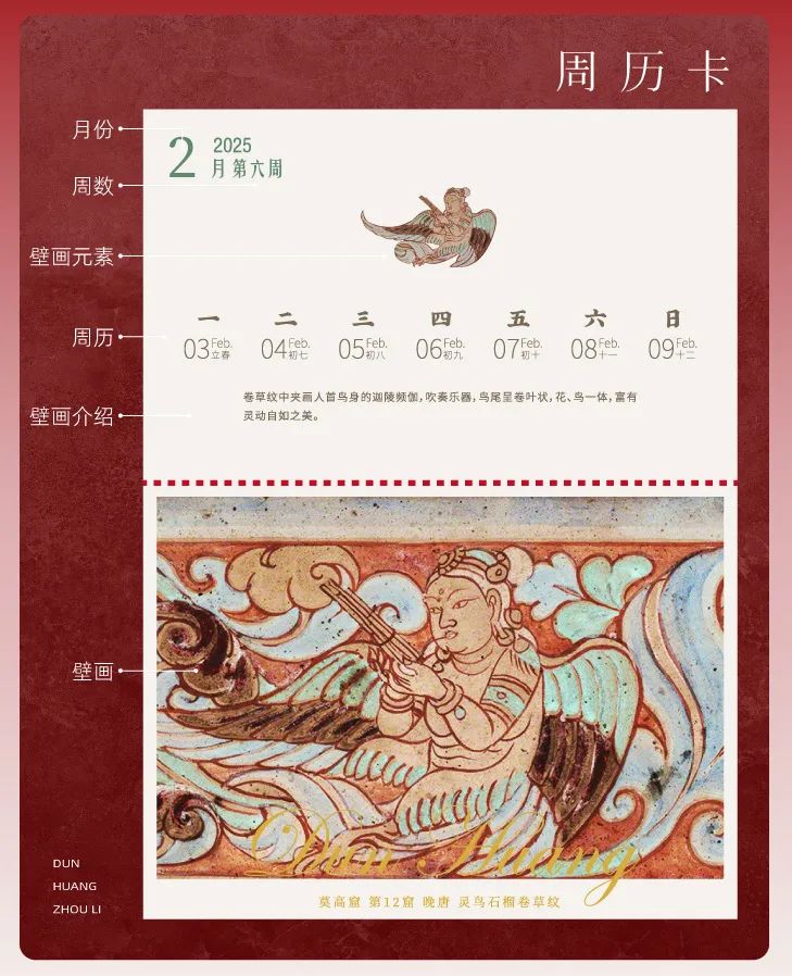 2024岁末之际,敦煌匠心独具,隆重推出2025年《敦煌周历》,54幅高清壁画原图,收录纹样、乐器、动物、神明四类壁画,一年四季各有特色主题,陪伴我们度过2025年的每一天。