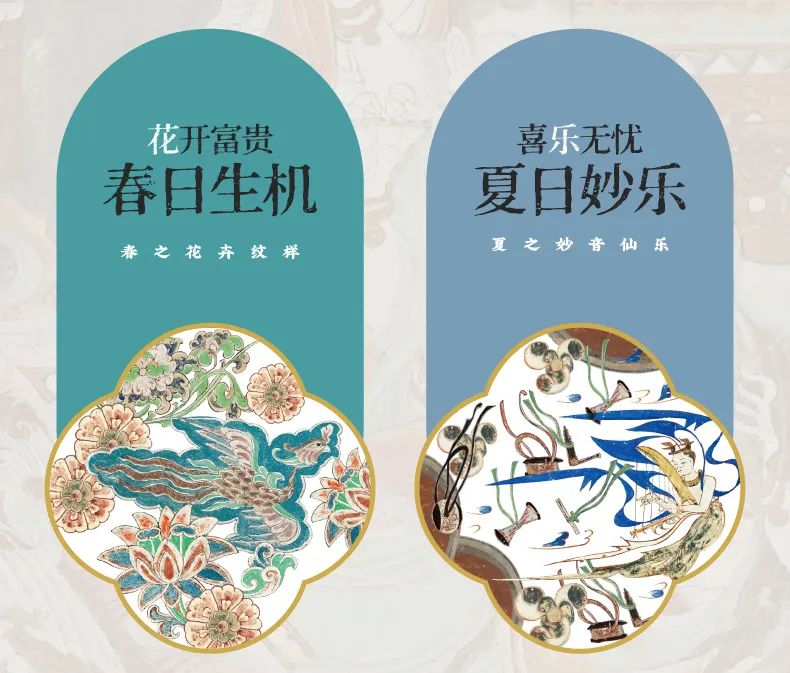 这54幅壁画,分为“纹样、乐器、动物、神明”四个主题,结合贯穿全年春夏秋冬四大单元,紧扣岁时节令,祥呈吉福,瑞庆大来。