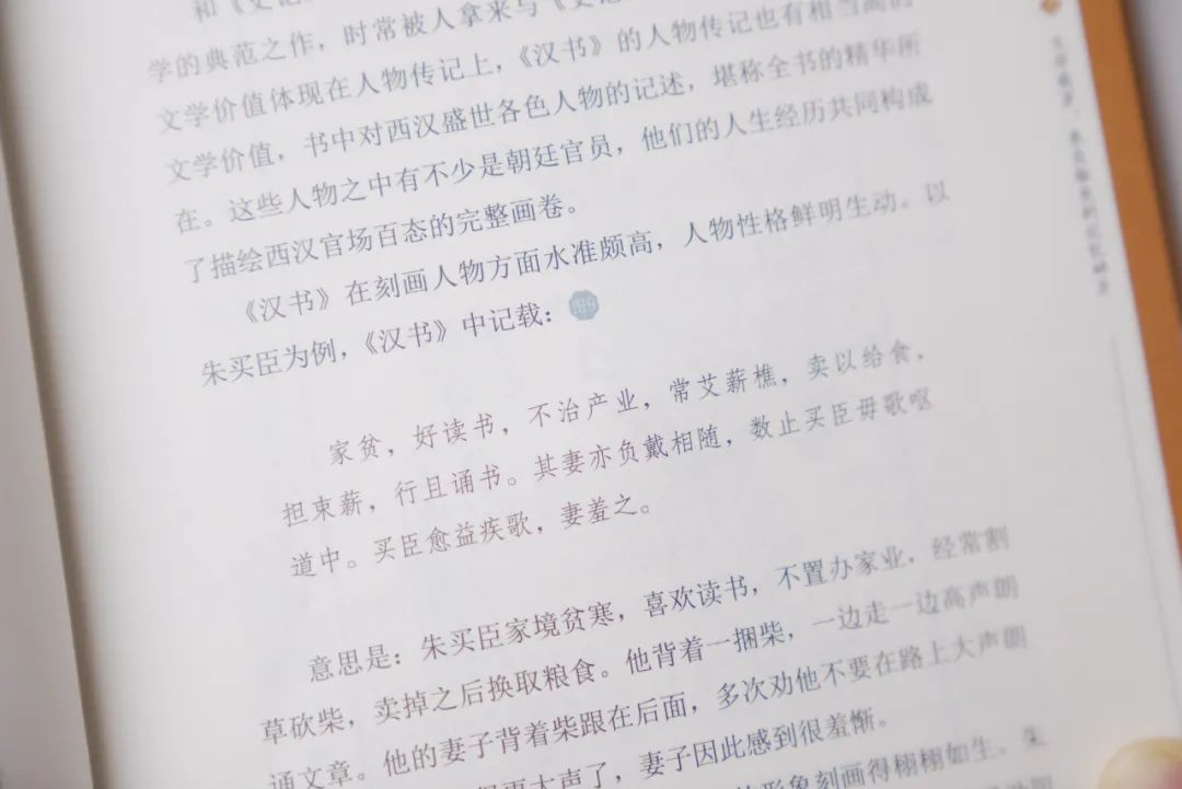 精彩处,还会进行“原文“赏析,比如,为了展示《汉书》刻画人物的高超,就以朱买臣为例进行了解读: