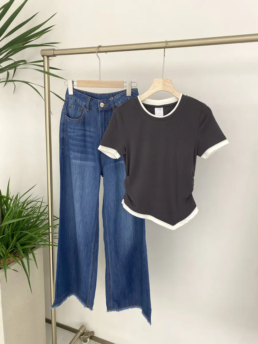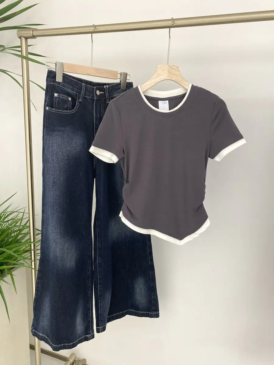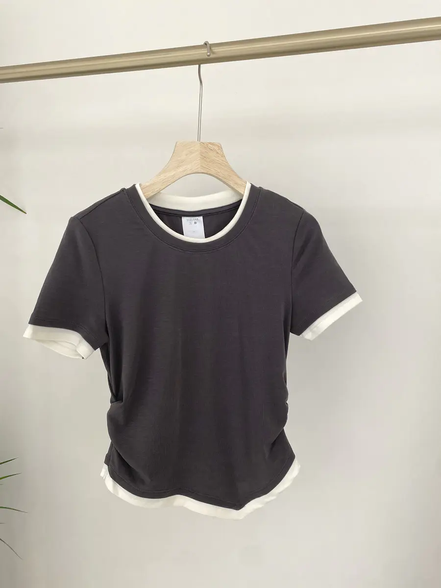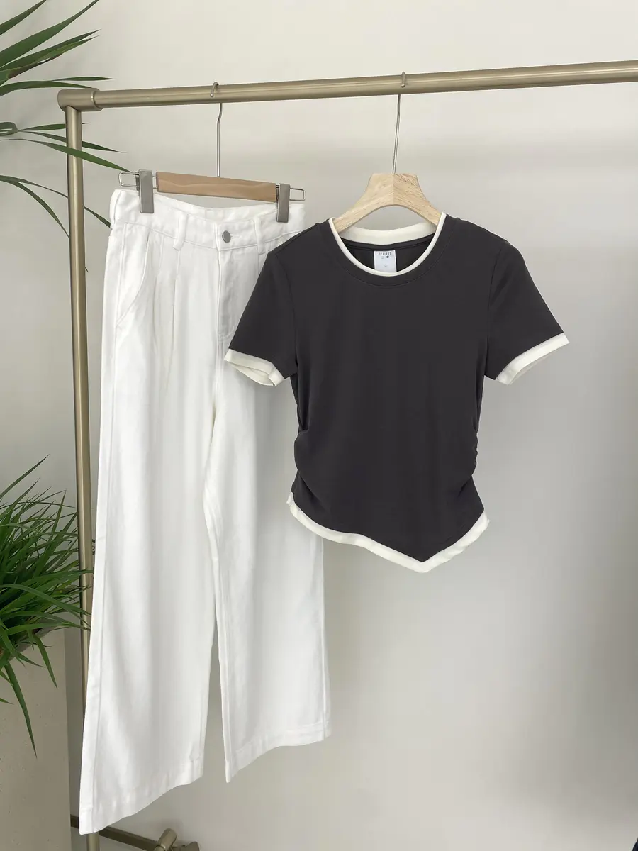 下摆设计更是特别,斜裁的边缘不需要塞进裤子也很好看,腰部做了抽褶的设计,让T恤也可以穿出腰身,超级显瘦~