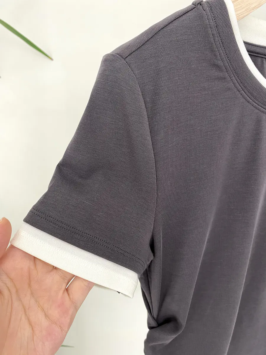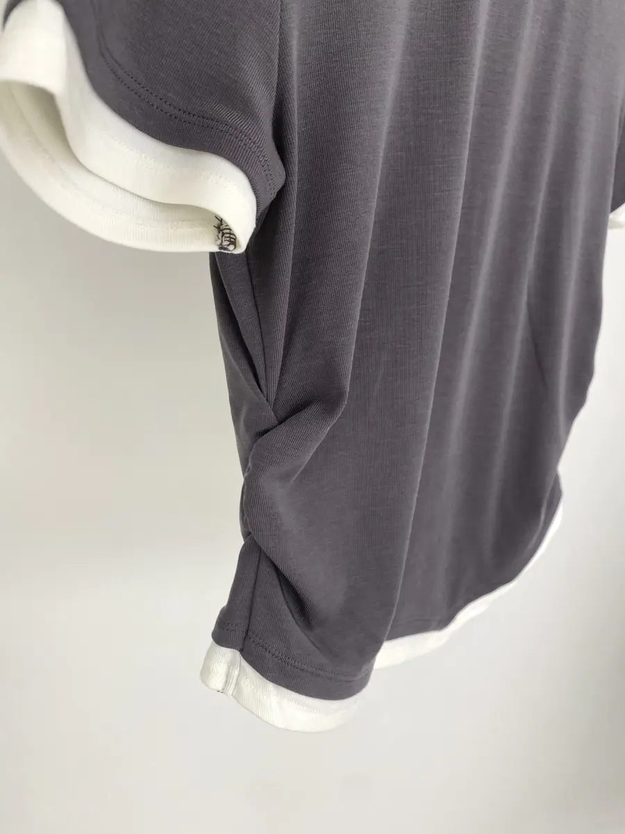 舒适莱赛尔面料,触感丝滑凉感,采用今年流行的假两件拼接设计,别致撞色大批单调