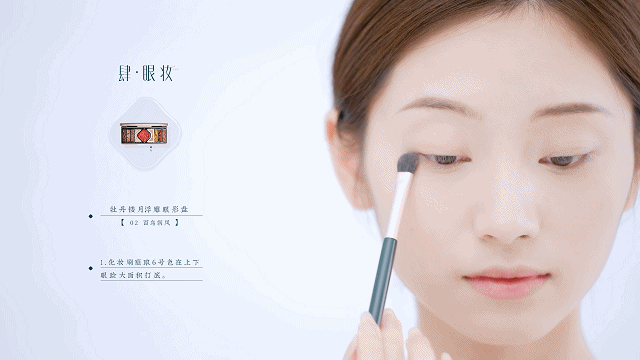 先用哑光肉粉色眼影大面积打底上眼睑;