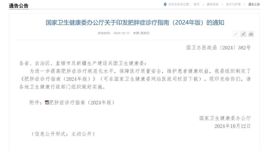10月17日国家卫健委在其官方网站正式对外发布《肥胖症诊疗指南(2024年版)》(以下简称诊疗指南),按照多家官方媒体消息,这是国内首部肥胖多学科诊疗指南发布。距离今年6月份国家卫健委等多部门发布的《“体重管理年”活动实施方案》不足4月,足见政策层对“肥胖疾病”的重视。重视背后是因为近年来,我国超重和肥胖人群的患病率呈持续上升趋势。作为慢性疾病中的独立病种及多种慢性疾病的重要致病因素,肥胖症已成为我国重大公共卫生问题,是我国第六大致死致残主要危险因素。随着大家对肥胖危害认识更加全面,更多人开始认识到“肥胖”确实是一种病,也开始主动到医院接受治疗。而指南的出台为医疗机构、医生从临床层面上治疗“肥胖病”提供了一份全面的遵循指南,更有益于促进“医疗减重”的发展。