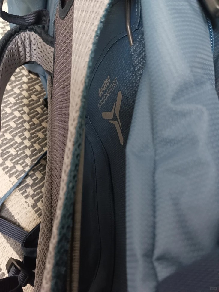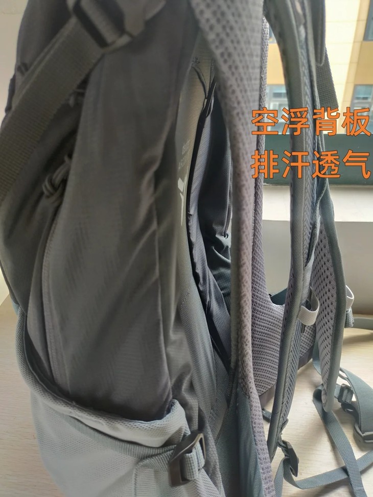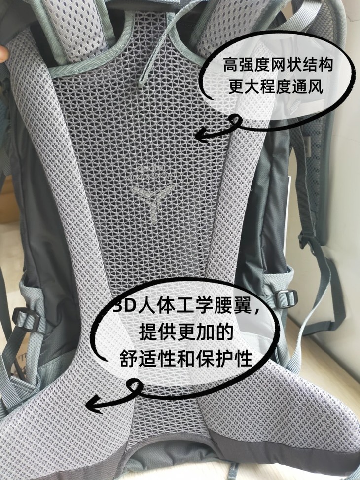 悬浮背负系统配air comfort标识,后背和背包之间留了透气通道,夏天背着走也不会闷出一身汗,亲测透气感绝了!